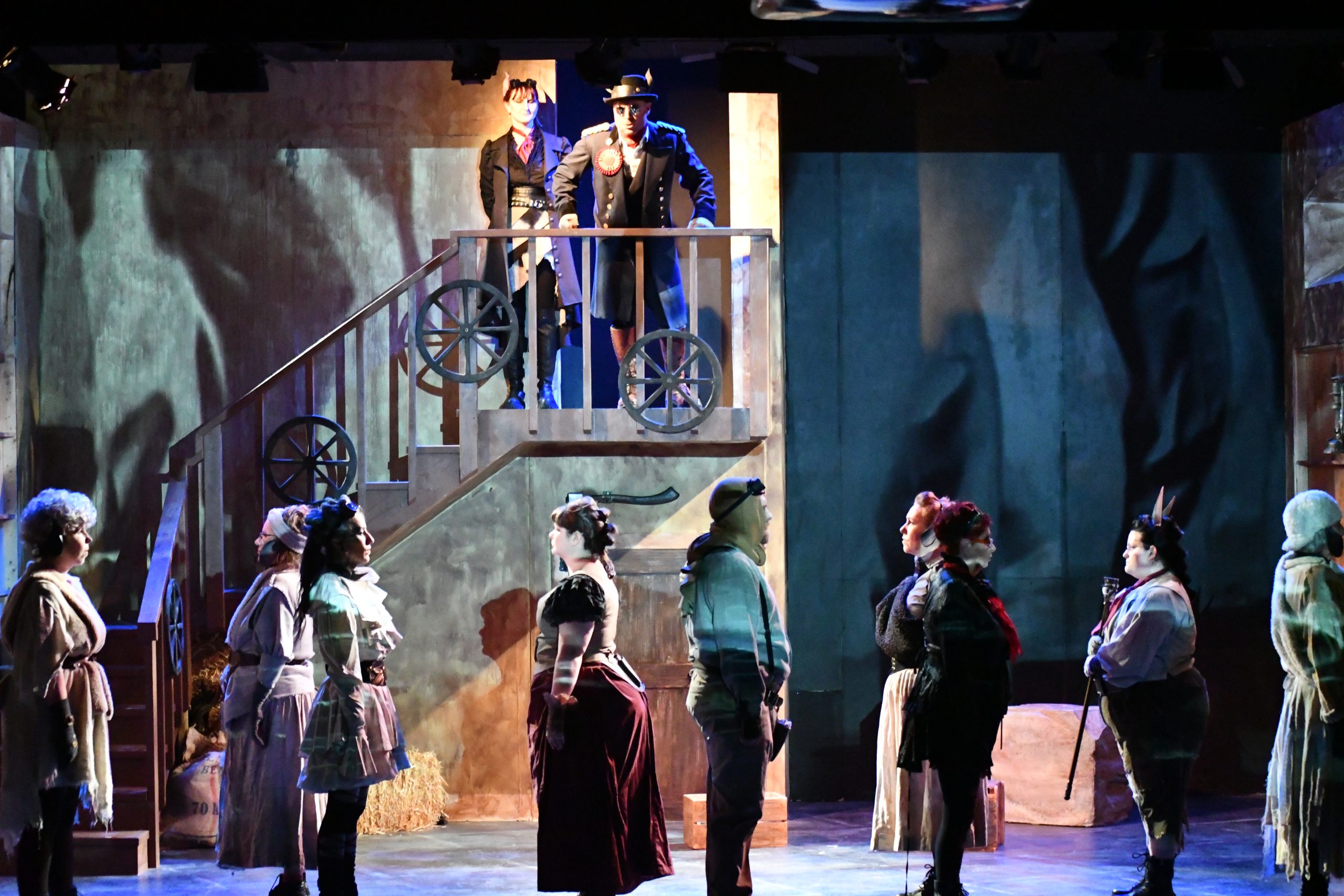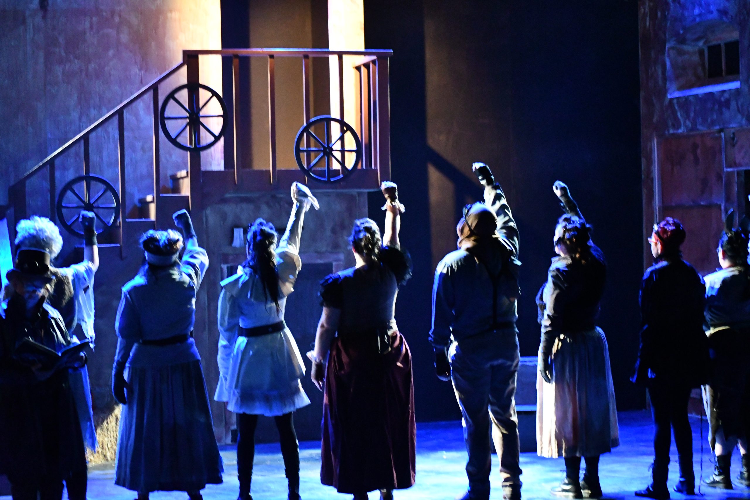 Animal Farm is not a feminist text. It is written in a time and tenor that isn’t inclusive in its language, or in its conceptualization of power. Its characters are for the most part male, with the female characters lesser, in places demeaned for their shallowness, and mostly without power. And in the production of our play, there were hard moments where sexist practices surfaced without challenge. And yet, our cast was mostly female and non-binary actors, our production team almost solely women, and the story that our play ultimately told was one where the final moments were not of animals who could not longer be distinguished from humans, but a moment between a parent and child, where care and compassion created space for hope.